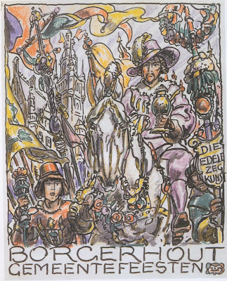 In 1936 schoof hij die tristesse even aan de kant en herhaalde zijn thema’s van voor de oorlog voor deze affiche ter gelegenheid van de Borgerhoutse Gemeentefeesten. Op de affiche beeldde hij de stoet af die op die dag uitging. De man rechts op de affiche geeft aan wat er zo nog op het programma stond: “Die edele zegkunst”. Op de achtergrond zie je het gemeentehuis (nu districtshuis) van Borgerhout.